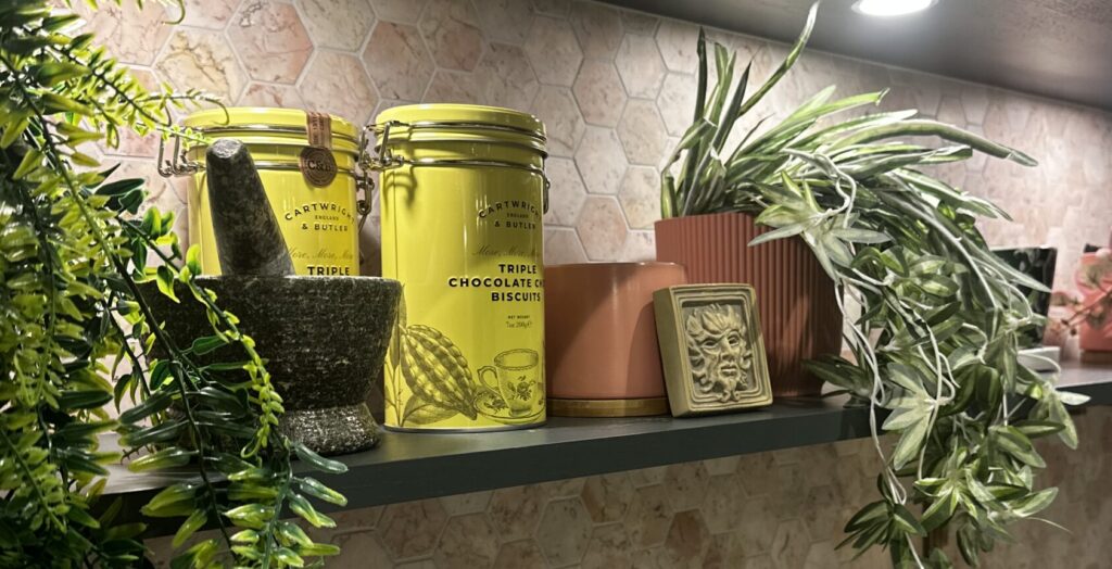 Plants are one of the easiest ways to make open shelving feel fresh and styled. Some good options are trailing plants and small herbs to fill space. If you don’t have a green thumb and don’t want to worry about the life of a plant, faux greenery can work beautifully, especially when paired with neutral tones. Just be mindful of steam and heat if your shelves are close to the hob or the sink. As for extras, a few carefully chosen accessories go a long way, just be careful not to overload the shelf with too many pieces to avoid decorative clutter. Consider ceramic vases, cookbooks that have pretty spines or sculptures. A framed print here and there can also add to the overall look of the shelf, especially if it is linked to the kitchen world!